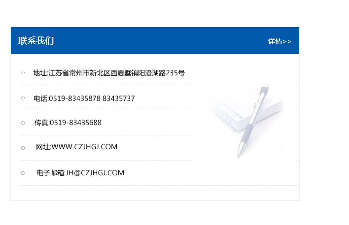 地址:常州市新北區(qū)友邦商務大廈1幢16、17層  電話:0519-85101652  傳真:0519-85112595  郵編:213022  網(wǎng)址:www.cz-jiayue_cn.briautomall.com  郵箱:xiajifengaa@163.com